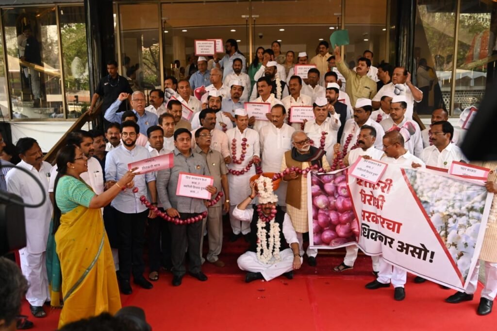 राज्यातील कांदा उत्पादक आणि कापूस उत्पादक शेतकऱ्यांना सरकारकडून न्याय मिळत नसल्याने अर्थसंकल्पीय अधिवेशनाच्या दुसर्या दिवशी कांदा आणि कापसाच्या माळा घालून महाविकास आघाडीचे आमदार शेतकऱ्यांसाठी आक्रमक झाल्याचे पाहायला मिळाले. सरकारने कापसासाठी निर्यात धोरण तयार करावे व कांद्याला योग्य हमी भाव मिळायला द्यावा, अशी मागणी महाविकास आघाडीच्या आमदारांनी यावेळी केली.