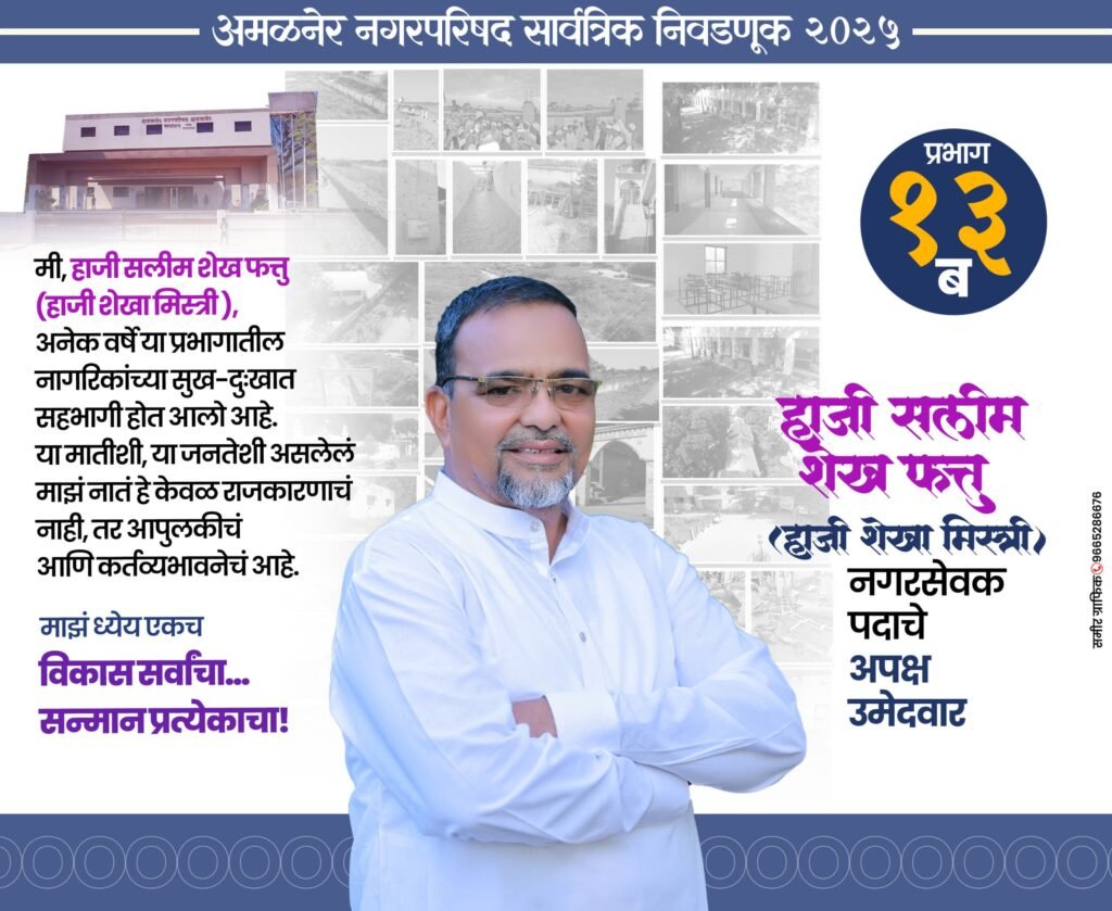अमळनेर – आगामी नगरपरिषद निवडणुकीत वार्ड क्रमांक ५ (ब) मधून (एफ.वाय.बी.ए.) शिक्षण घेतलेली शेख आशु परवीन रफिक या अपक्ष उमेदवारांनी उमेदवारी जाहीर केली असून, “आपला ध्यास फक्त विकास” या ब्रीदवाक्यासह त्यांनी मतदारांपर्यंत आपला विकासदृष्टीकोन पोहोचवण्यास सुरुवात केली आहे.