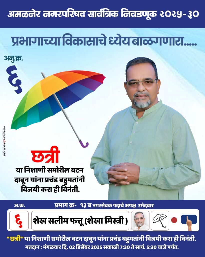 अमळनेर –नगरपरिषद निवडणूक २०२५ च्या पार्श्वभूमीवर प्रभाग क्रमांक १३(ब) मध्ये राजकीय वातावरण चांगलेच तापू लागले आहे. रविवारी, दि. २३ रोजी दुपारी ४ वाजता अपक्ष उमेदवार हाजी सलीम शेख फत्तू (शेखा मिस्त्री) यांनी भव्य प्रचार रॅली काढत प्रभावी शक्तिप्रदर्शन केले.