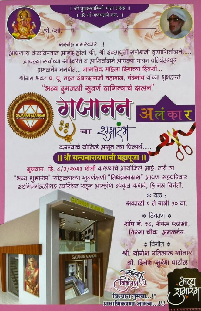 प्रथम 5 हजार ग्राहकांना मिळणार भेटवस्तू,,, ग्राहकांना देवता संबोधणाऱ्या योगेश सोनार व दिनेश पाटील यांनी आपल्या दालनात प्रथम येणाऱ्या 5 हजार ग्राहकांना सोने दागिने खरेदीवर आकर्षक भेटवस्तू देण्याची योजना जाहीर केली असून ही योजना निश्चितच ग्राहकांसाठी फलदायी ठरणार आहे. गा गजानन अलंकार चे हे दालन सरकार मान्य BIS 916 हॉलमार्क सोन्याचे दागिने मिळण्याचे विश्वसनीय ठिकाण राहणार असून पारदर्शी व्यवहार आणि विनम्र तत्पर सेवा हेच धोरण अवलंबविले जाणार आहे.