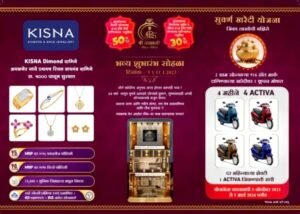 आपल्या तिसऱ्या भव्य शोरूमचे दालन ग्राहकांसाठी रविवार पासून खुले करत आहे. या शुभारंभानिमित्त ग्राहकांसाठी विशेष ऑफर जाहीर करण्यात आली आहे. 916 हॉलमार्क • असणाऱ्या दागिन्यांचा मजुरीवर 50% सूट दिली जाणार आहे तसेच शुभारंभाच्या दिवसाच्या पुढील सहा दिवस 916 हॉलमार्क सोन्याचा दागिन्यां